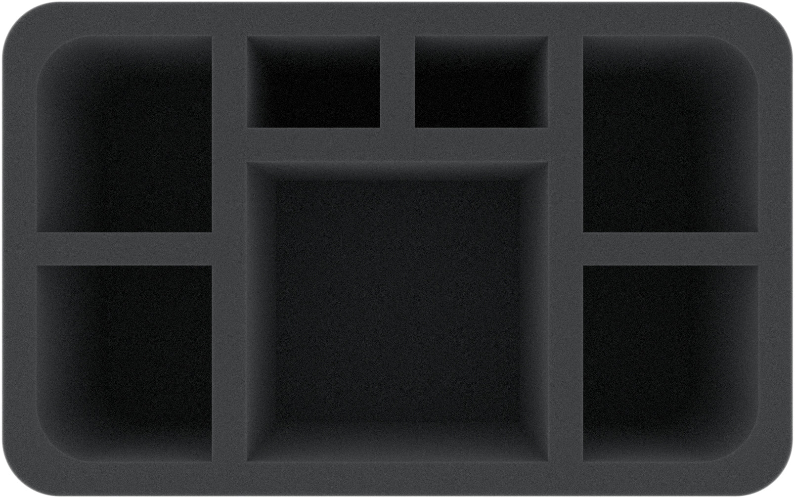 This Half-Size foam tray has 7 compartments of different sizes, one large square compartment, two medium-sized compartments and two smaller rectangular compartments. The insert is particularly suitable for safely storing a large miniature and several medium-sized figures for various board games and tabletop systems.