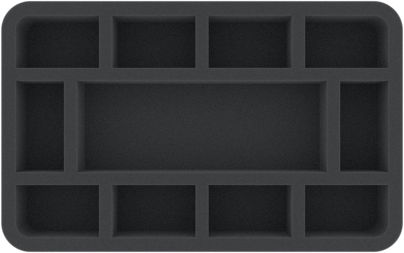 Esta bandeja de espuma Half-Size está dividida en 11 compartimentos de diferentes tamaños. Es particularmente adecuada para el almacenamiento seguro de miniaturas para varios juegos de mesa y sistemas de mesa. El material de los juegos u otras piezas pequeñas también pueden ser guardadas aquí.