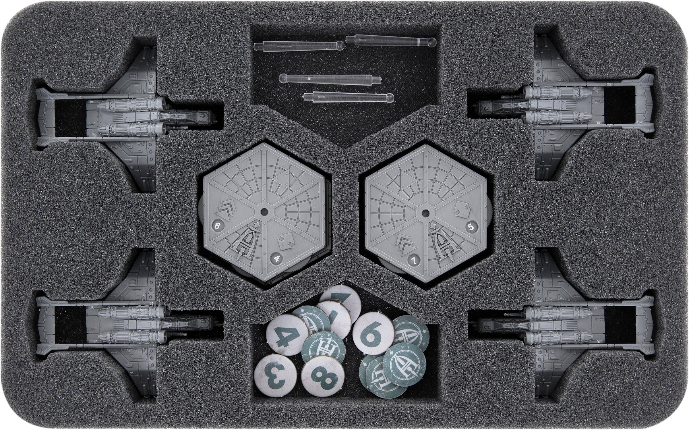 In the 2 oblong compartments you can put tokens or small parts, such as missiles and bombs, while the bases are placed in the 2 hexagonal compartments.