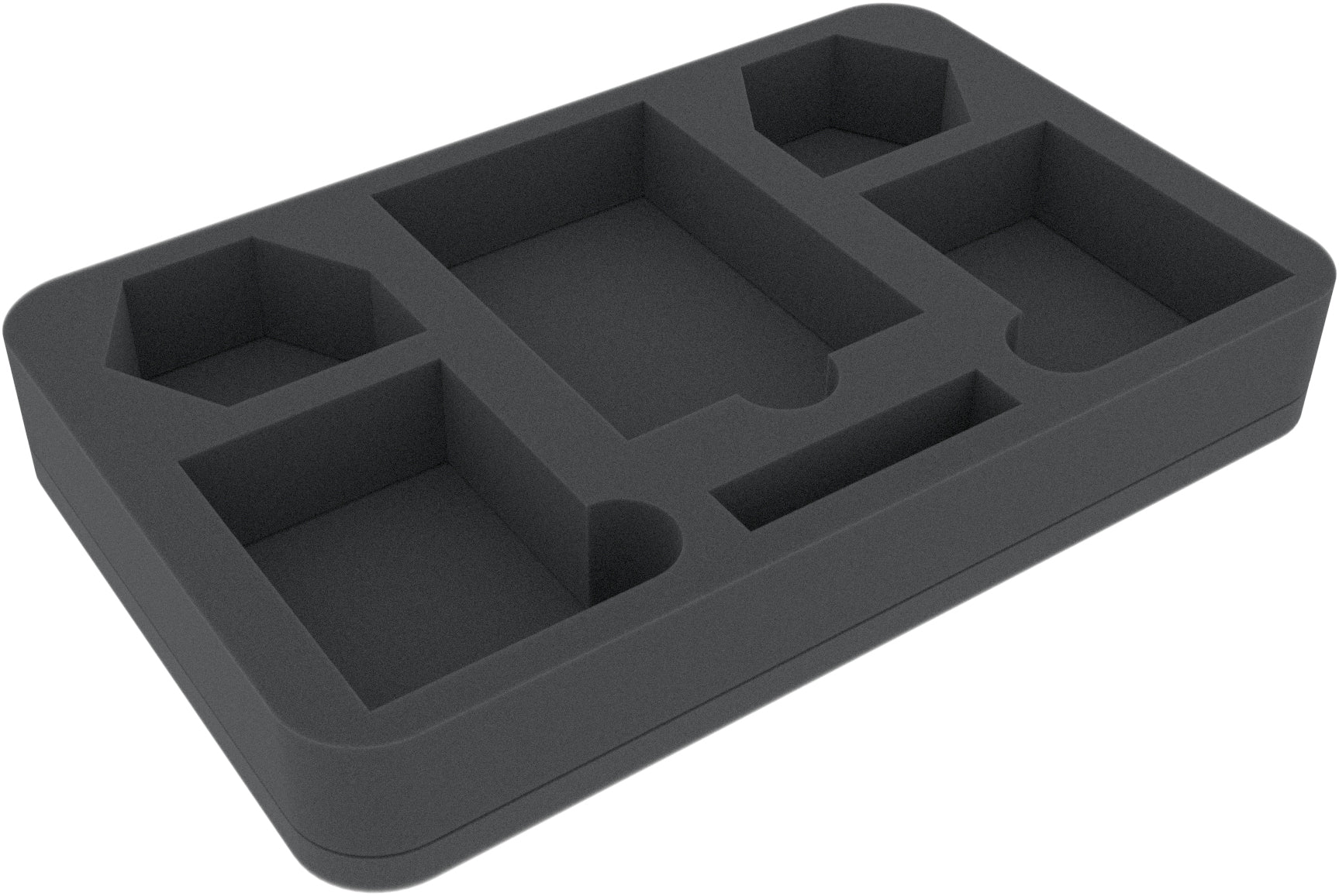 Esta bandeja de espuma Half-Size tiene 6 compartimentos de diferentes tamaños. Es particularmente adecuada para almacenar materiales de juego como cartas, marcadores o fichas de forma ordenada.